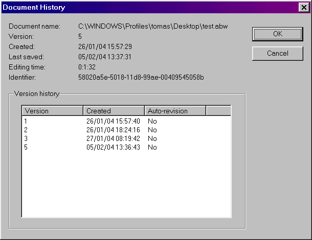 → Document history and revisions are moving on quite splendidly! Full history tracking, as mentioned in “commit (HEAD): reversible history,” is implemented, allowing users to view a document at any point in its development. To give you an idea of how far it's implemented to date, I present the following screenshots: the History Dialogue, the Compare Documents Dialogue and the List Documents Dialogue